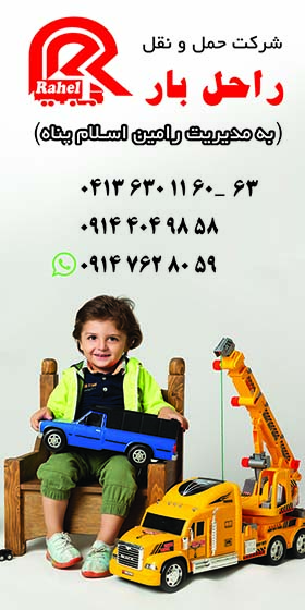 موسسه حمل و نقل راحل بار آذر به مدیریت رامین اسلام پناه سالهاست که با ارائه خدمات ائم از : ارسال انواع تریلی ، 10 چرخ ، 6 چرخ ، خاور ، کامیونت ، نیسان و وانت به تمام نقاط ایران از تبریز و بالعکس توانسته رضایت مشتریان را جلب نموده و تحولی شگرف در حمل و نقل منطقه آذربایجان بوجود بیاورد . امید است با یاری بیشتر شما عزیزان خدمات موسسه راحل بار نیز روز به روز بیشتر شده و در خدمت شما عزیزان و مشتریان باشد .
